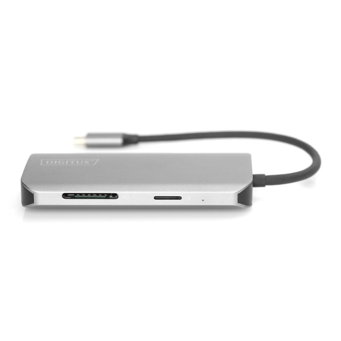 Док-станція Digitus USB-C™. Серед іншого присутні інтегровані 2 інтерфейси HDMI® з роздільною здатністю до 4K/30 Гц, при одночасному підключенні 2-х моніторів підтримується роздільна здатність Full HD 1080P/60 Гц. Під час роботи з док-станцією можна заряджати підключений ноутбук через порт USB-C™. Максимальна потужність заряджання становить 100 Вт. Крім того, на борту є два роз'єми USB 3.0, до яких можна підключити відповідні периферійні пристрої, такі як клавіатура, миша або зовнішній жорсткий диск / USB-накопичувач.