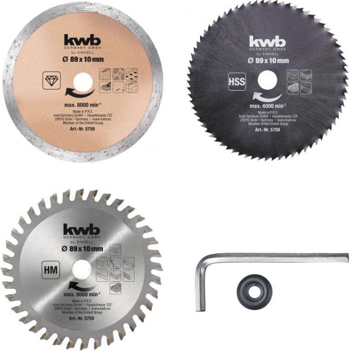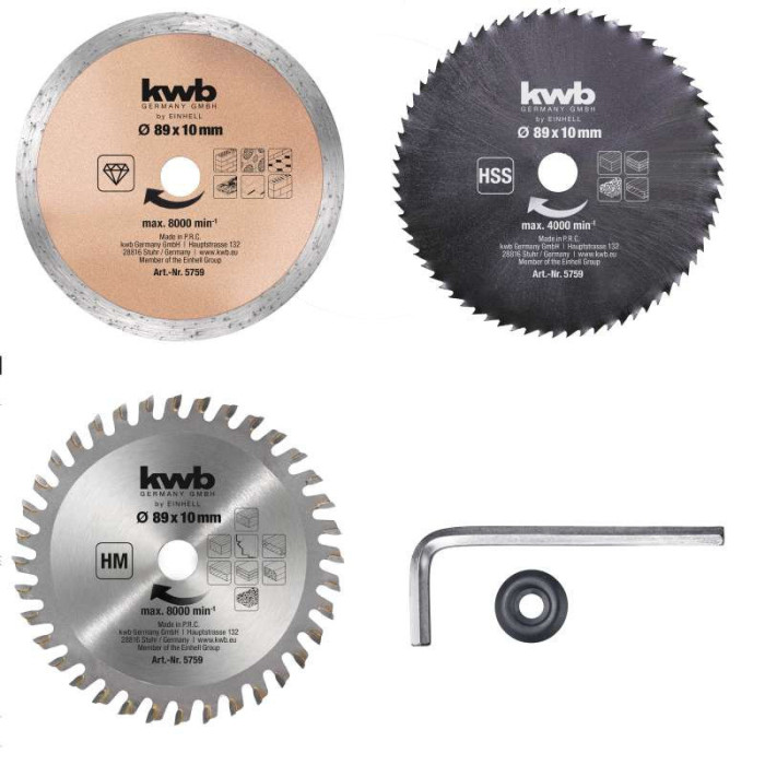 Набір дисків для роторайзера Einhell TC-CS 860 Kit і TC-CS 860/1 Kit ідеально підходить для різноманітних завдань різання. У комплекті алмазний диск для каменю та плитки, диск HW/HSS для роботи з деревом, а також HM/TCT диск для деревних матеріалів і пластику. Усі диски мають діаметр Ø89 мм і забезпечують високу точність різання. Комплект доповнюють шайба та гайковий ключ для зручного монтажу.