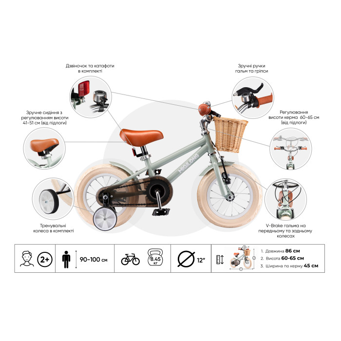 Дитячий велосипед Miqilong RM – це втілення сучасного бачення ретро дизайну. Стилізація під 50-ті роки ХХ століття та кошик ручного плетіння з натурального ротанга роблять дизайн велосипеда вишуканим та витонченим.