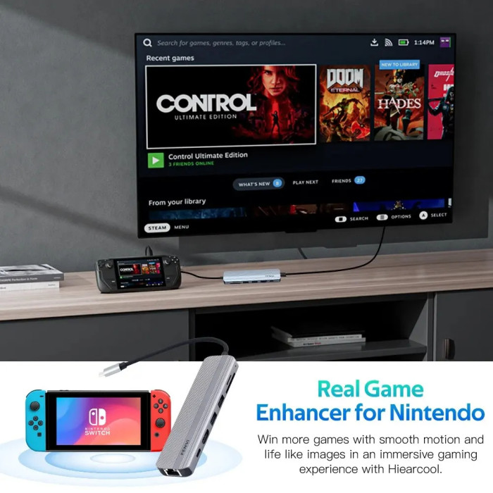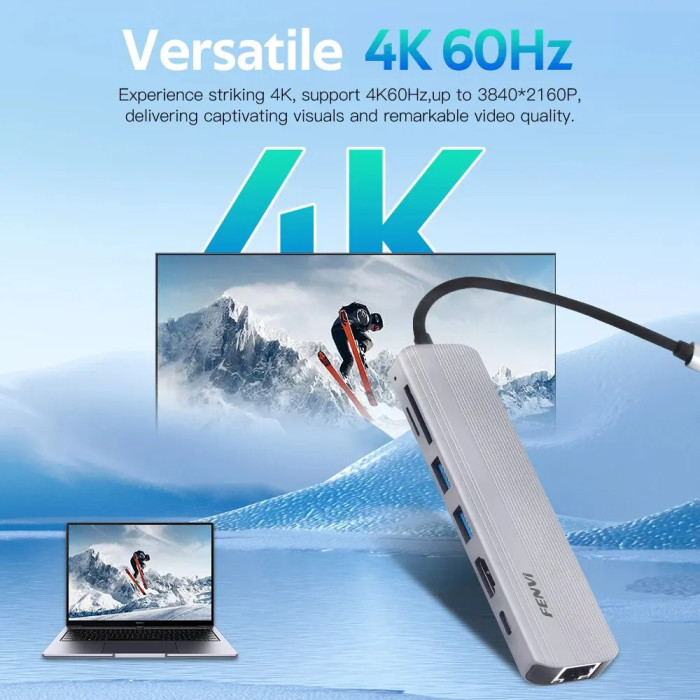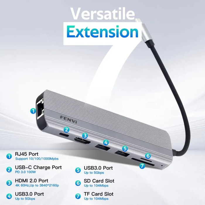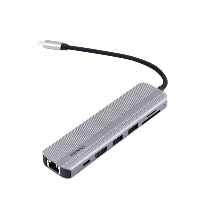 У цьому універсальному концентраторі FENVI F-C7205H Type-C є все необхідне для розширення можливостей вашого пристрою. Завдяки HDMI 2.0, 2 портам USB 3.0, зарядці PD, передачею даних, слотам для карток SD і TF і Gigabit Ethernet ви можете легко підключатися до кількох периферійних пристроїв і насолоджуватися швидкою та стабільною швидкістю передачі даних і заряджання.