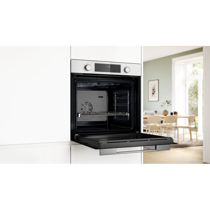 Bosch HUA736EV0T – вбудована електрична духова шафа XXL об’ємом 76 л з функцією додавання пари для хрусткої скоринки зовні та соковитої середини страви. Оснащена технологією 3D-гарячого повітря, системою AutoPilot 10, однорівневими телескопічними напрямними та покриттям EcoClean Direct для легкого очищення.