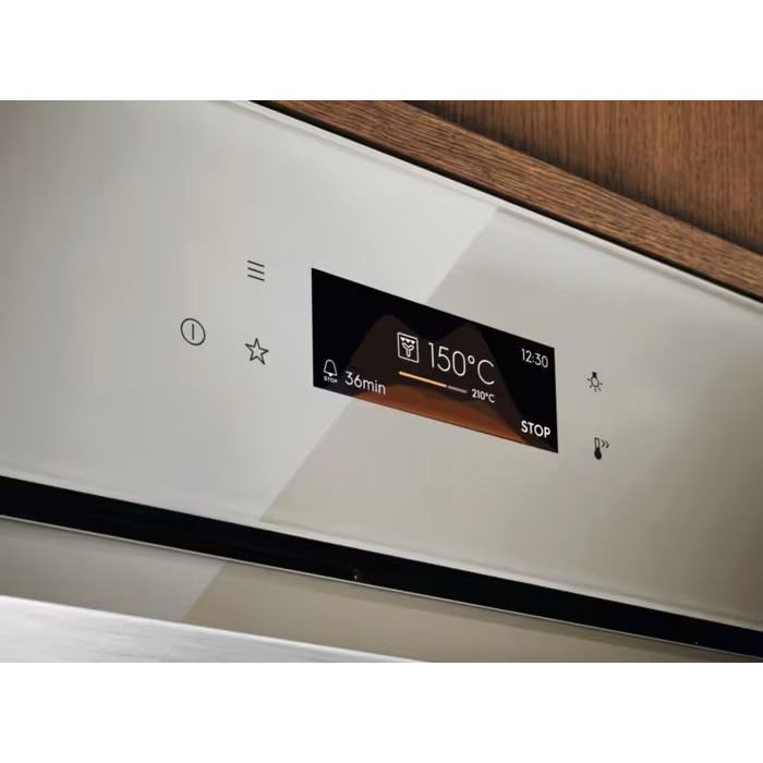 Electrolux LOE8F38S — стильна вбудована електрична духова шафа об’ємом 72 л, виконана в елегантному кольорі «шампань». Має енергоефективність A+, сенсорне керування та TFT-дисплей EXCite. Оснащена конвекцією SurroundCook® — вентилятор рівномірно розподіляє тепло по всій камері, а телескопічні напрямні спрощують доступ до листів. Підтримує тематичні режими: гриль, традиційне та багаторівневе випікання, піцу, розморожування, збереження тепла, пекарні програми, вирощування тіста тощо. Має функцію AquaClean (парова очистка) та каталіз — для зручного прибирання без хімії. Дверця із м'яким закриттям і двома склопакетами забезпечує безпеку та комфорт. Підходить для стильних кухонь та сімей, що цінують дизайн і зручність.