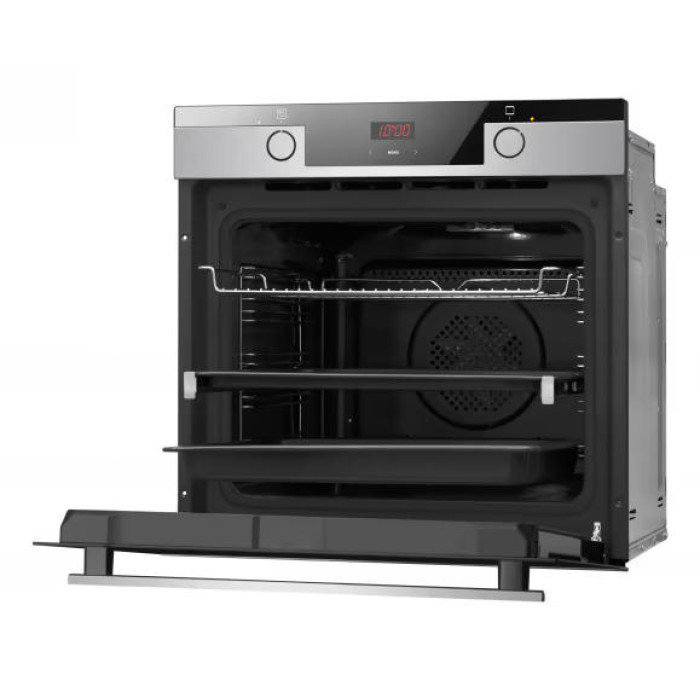 Електрична духова шафа Hansa BOEIS694097 з об’ємом 77 л і класом енергоефективності А пропонує 11 режимів приготування, включаючи турбоконвекцію, гриль, режим піци та функцію SoftSteam. Оснащена сенсорним програматором, LED-дисплеєм, плавним закриттям дверцят та системою легкого очищення.