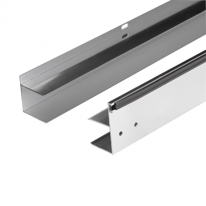 Глухое стекло, стеклянная дверь, расширительные профили, верхний профиль, нижний профиль, боковые профили, ручка, двойные ролики, комплект крепежей, набор уплотнителей, заглушки.