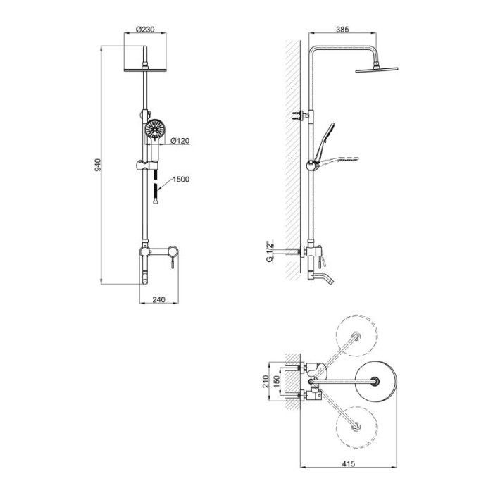 Смеситель, кронштейн для верхнего душа, лейка для верхнего душа, кронштейн для ручного душа, лейка для ручного душа, душевой шланг, душевая стойка, крепежи.