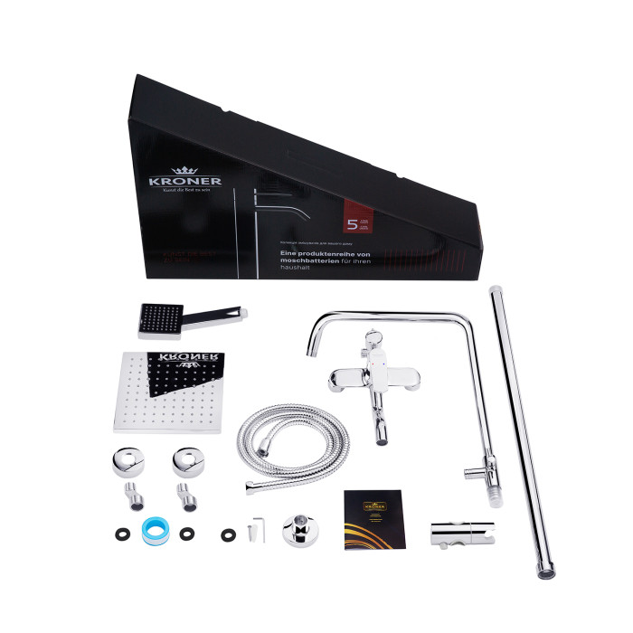 Душова система Kroner KRP Armada - C064Q - втілення комфорту та елегантності у вашій ванній кімнаті. Виконана у вишуканому кольорі хром, вона додасть розкіш і блиск до вашого душового простору. Завдяки двом режимам струменя: 1 режим у ручному душі та 1 режим у верхньому душі, ви отримаєте максимальний релакс і задоволення під час душу. Виготовлена з високоякісної латуні та ABS пластику, система надійна і довговічна. Квадратна форма лійки та глянцева поверхня надають їй стильний сучасний вигляд, який чудово поєднується з різними дизайнами ванних кімнат. Збудуйте свій особистий оазис затишку з душовою системою Kroner KRP Armada - C064Q.