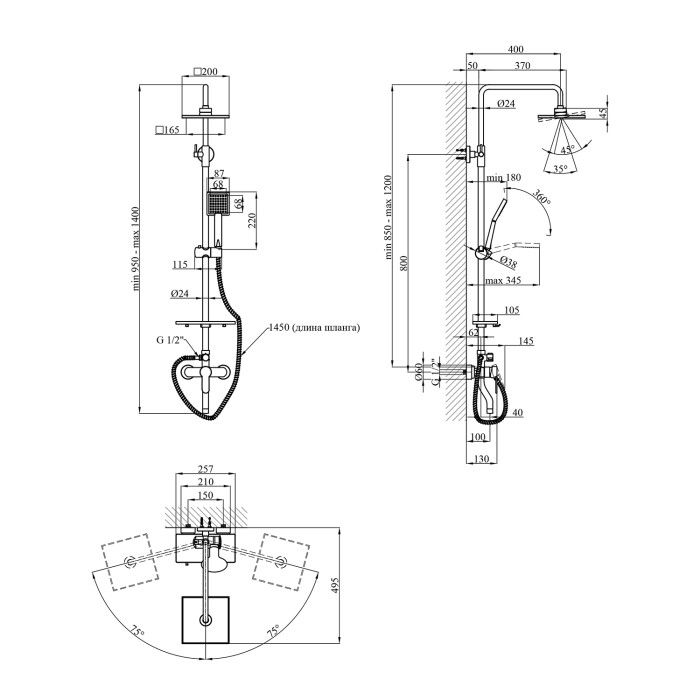 Змішувач, лійка з кронштейном для верхнього душу, лійка з кронштейном для ручного душу, душовий шланг, душова стійка, кріплення, фум стрічка.