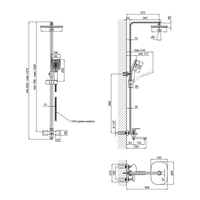Смеситель, кронштейн для верхнего душа, лейка для верхнего душа, кронштейн для ручного душа, лейка для ручного душа, душевой шланг, душевая стойка, крепежи.