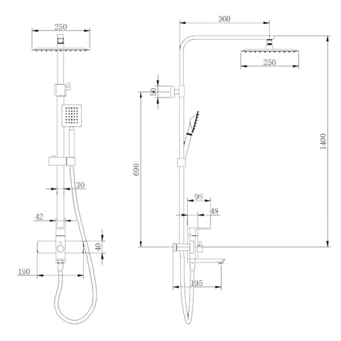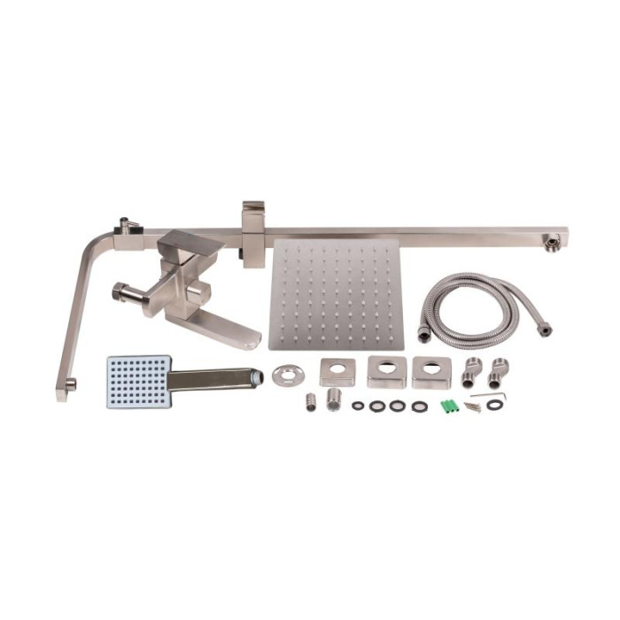 Смеситель, кронштейн для верхнего душа, лейка для верхнего душа, кронштейн для ручного душа, лейка для ручного душа, душевой шланг, душевая стойка, крепежи.