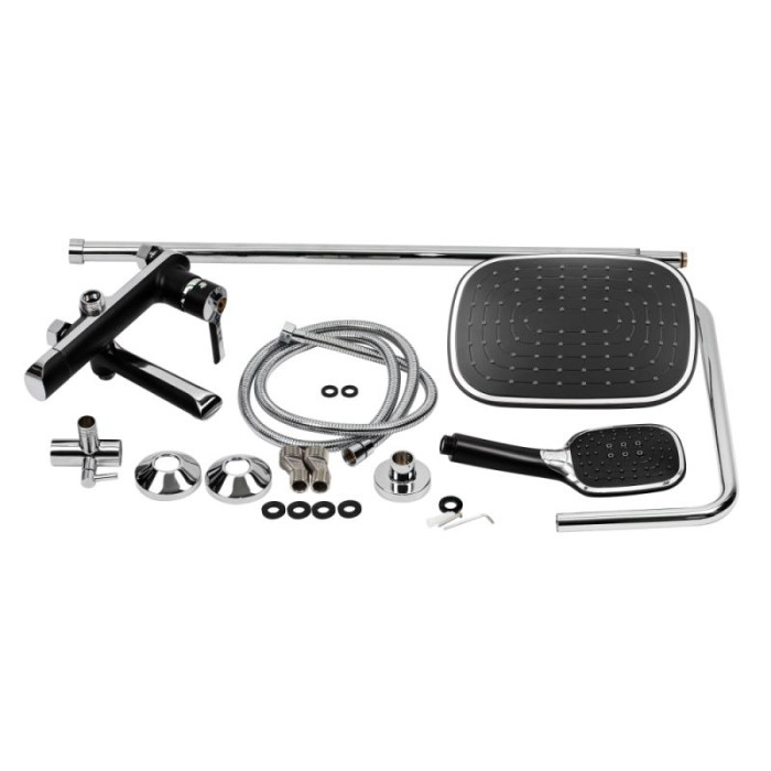 Смеситель, кронштейн для верхнего душа, лейка для верхнего душа, кронштейн для ручного душа, лейка для ручного душа, душевой шланг, душевая стойка, крепежи.
