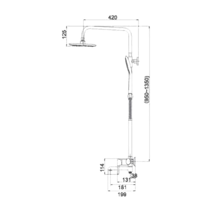 Смеситель, кронштейн для верхнего душа, лейка для верхнего душа, кронштейн для ручного душа, лейка для ручного душа, душевой шланг, душевая стойка, крепежи.