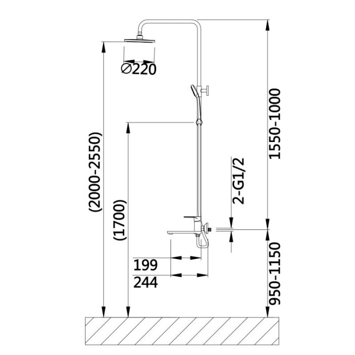 Смеситель, кронштейн для верхнего душа, лейка для верхнего душа, кронштейн для ручного душа, лейка для ручного душа, душевой шланг, шланговое подсоединение, крепежи.