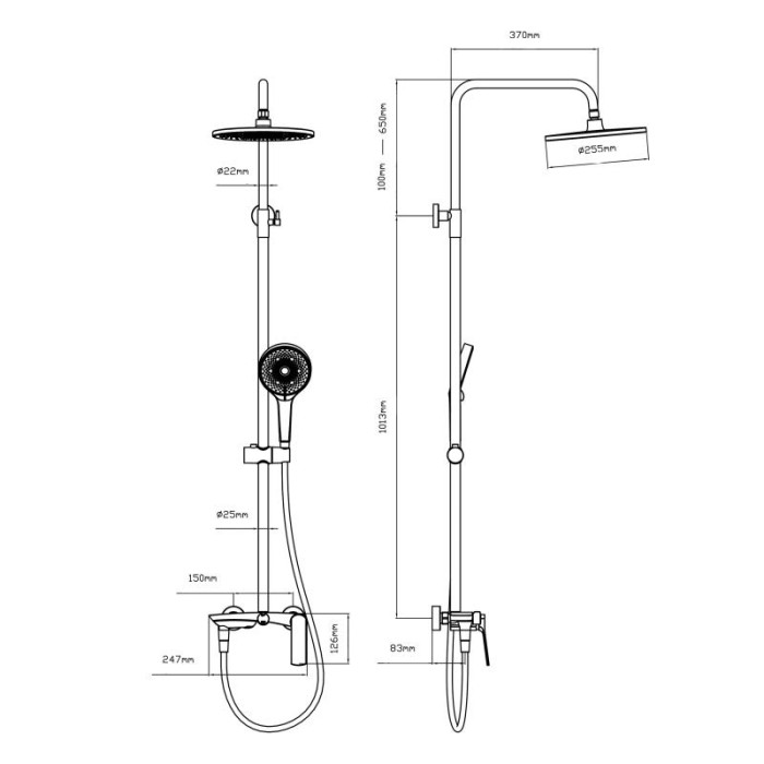 Смеситель, кронштейн для верхнего душа, лейка для верхнего душа, кронштейн для ручного душа, лейка для ручного душа, душевой шланг, душевая стойка, крепежные детали.