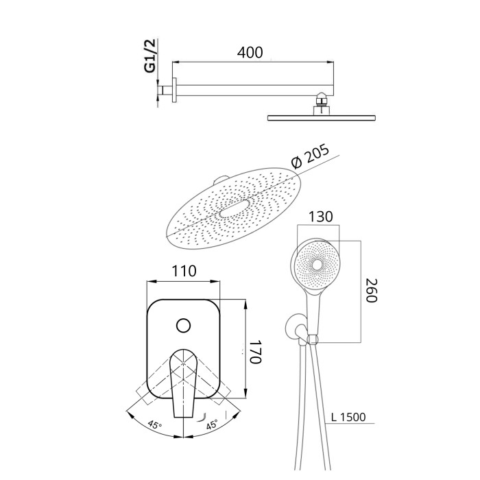 Лейка верхнего душа: 205х205х50; ручна лейка: 130х50х260; смеситель: 110х30х170