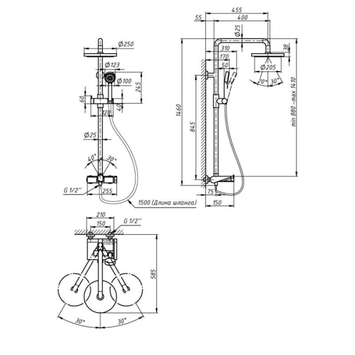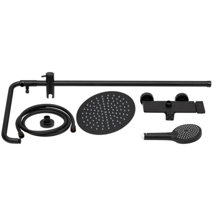 Смеситель, кронштейн для верхнего душа, лейка для верхнего душа, кронштейн для ручного душа, лейка для ручного душа, душевой шланг, душевая стойка, крепежи.