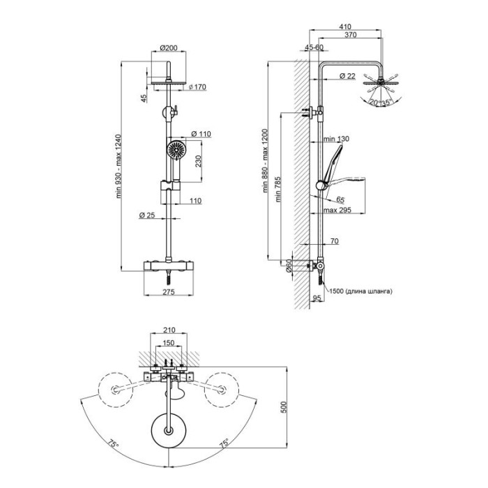 Высота душевой стойки, мм