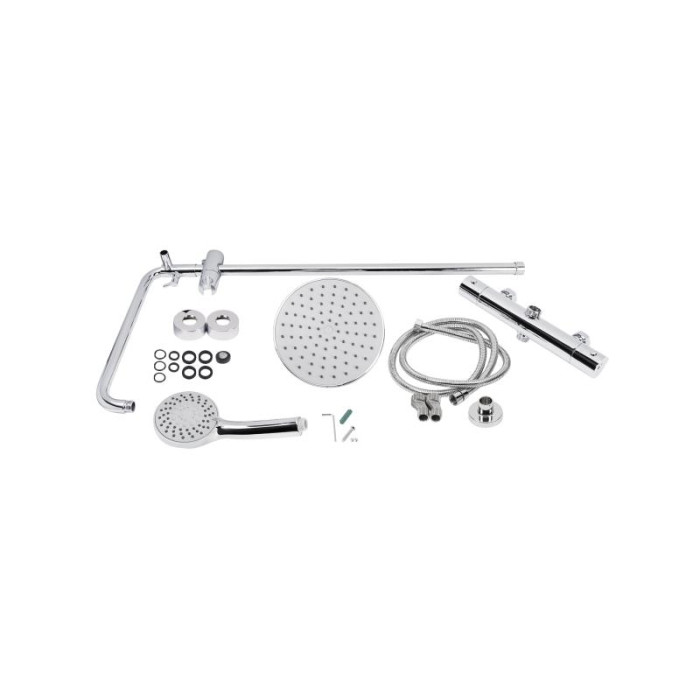 Смеситель, кронштейн для верхнего душа, лейка для верхнего душа, кронштейн для ручного душа, лейка для ручного душа, душевой шланг, душевая стойка, крепежи.