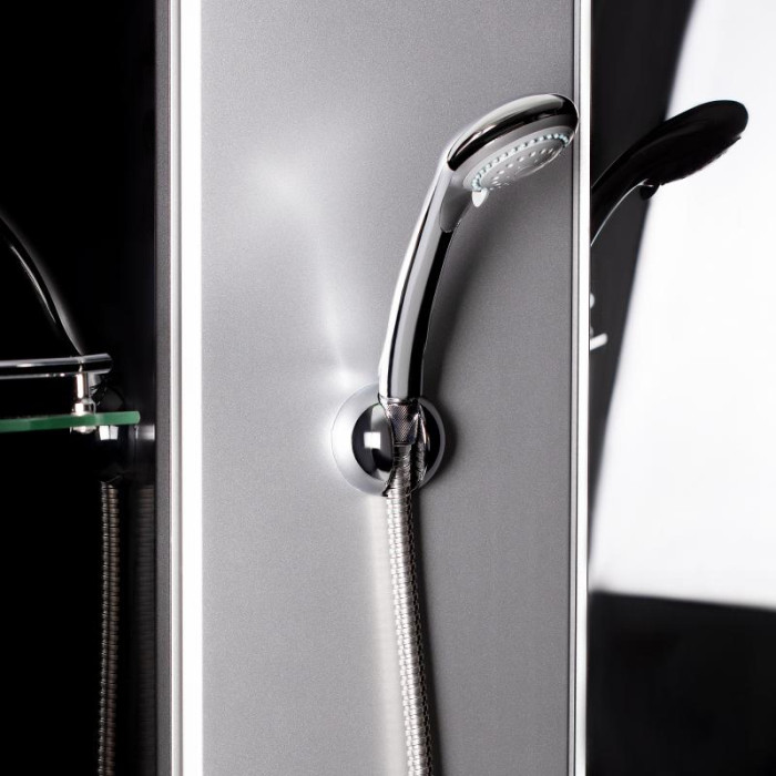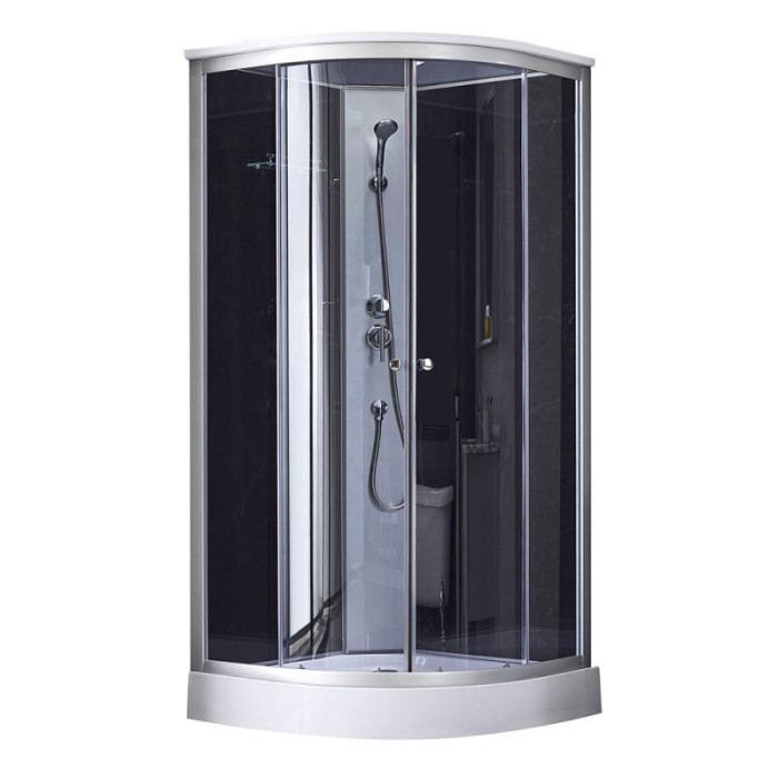 Поддон, сифон, двери, ручки, ролики, профиль, комплект крепежей, задняя стенка, панель, смеситель, лейка для ручного душа, лейка для верхнего душа, душевой шланг, кронштейн, ножки, верхняя крышка, стеклянная полка.