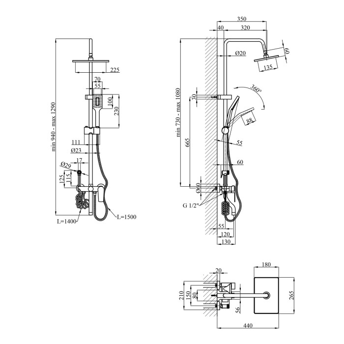 Высота душевой стойки, мм