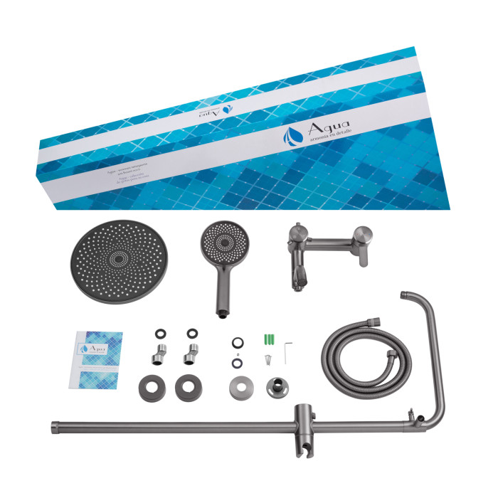 Змішувач, стійка, кронштейн для верхнього душу, лійка для верхнього душу, кронштейн для ручного душу, лійка для ручного душу, шланг, кріплення.