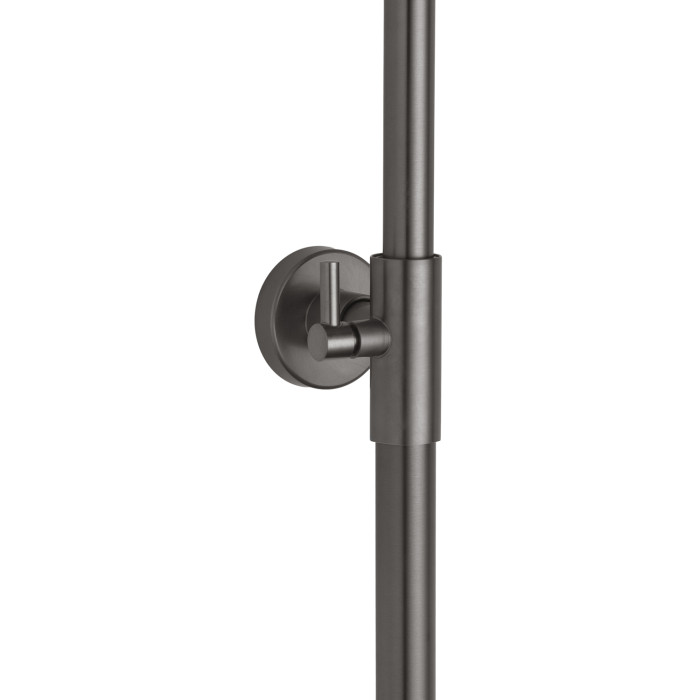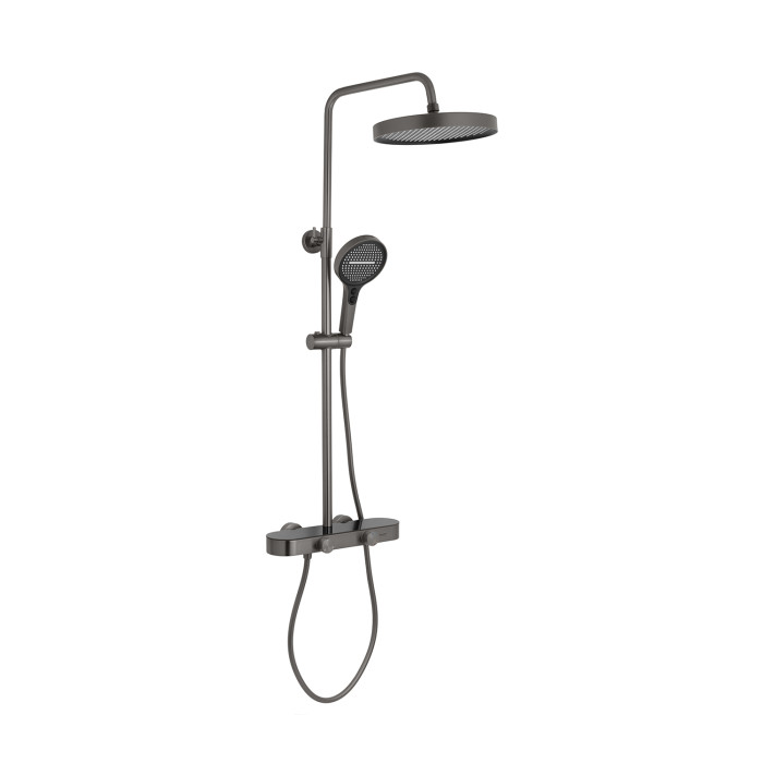 Конструкція виготовлена з латуні та міцного ABS пластику, що гарантує довговічність, стійкість до корозії та механічних пошкоджень. Двошарове нікель-хромове покриття у поєднанні з графітовим відтінком робить систему не лише надійною, а й візуально привабливою.