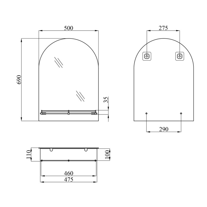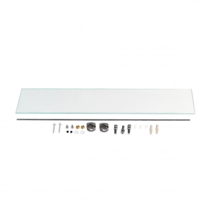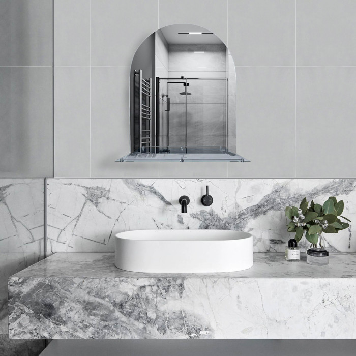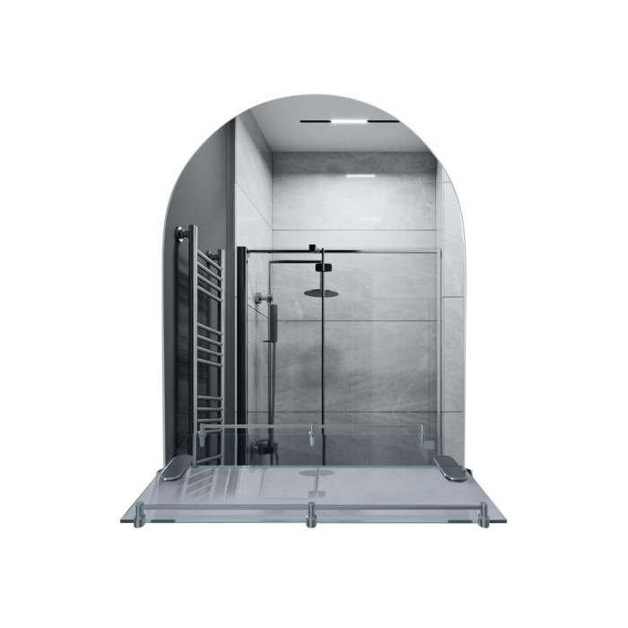 Дзеркало KRM Belantis - ACS703 від Kroner з полицею 500х680х100 кріпиться до стіни за допомогою шурупів, які входять до комплекту. Його можна помістити над умивальником у приміщенні з будь-яким інтер'єром завдяки лаконічному дизайну. Дзеркало вироблено з дугоподібним верхом. Комплектується разом із поличкою 480х100 мм із прозорого скла з хромованим бортиком, що запобігає випадковому падінню гігієнічних засобів. Полиця кріпиться до дзеркала за допомогою металевих тримачів.