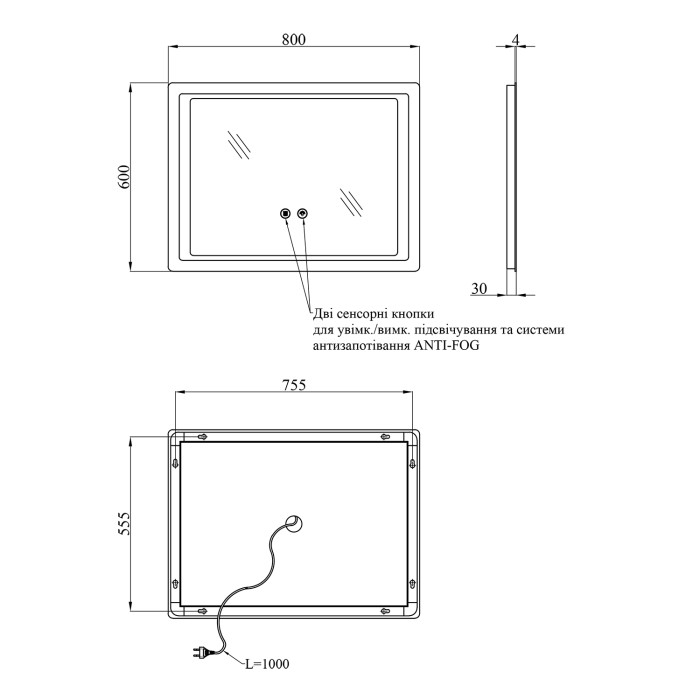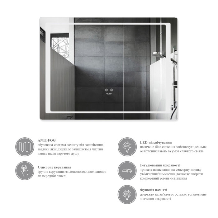 - ANTI-FOG – вбудована система захисту від запотівання, завдяки якій дзеркало залишається чистим навіть після гарячого душу.
