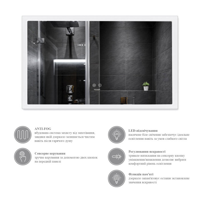 - ANTI-FOG – вбудована система захисту від запотівання, завдяки якій дзеркало залишається чистим навіть після гарячого душу.