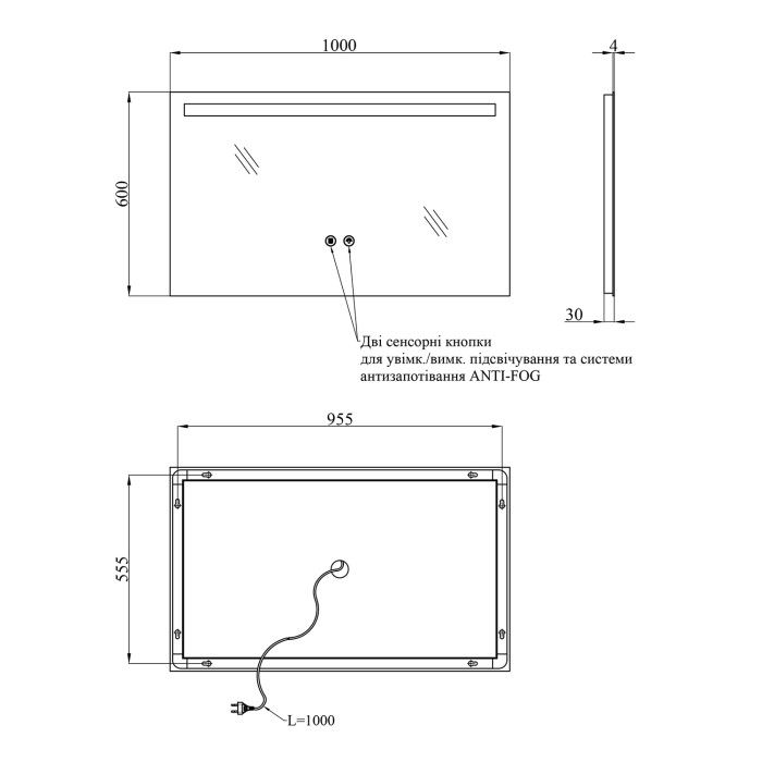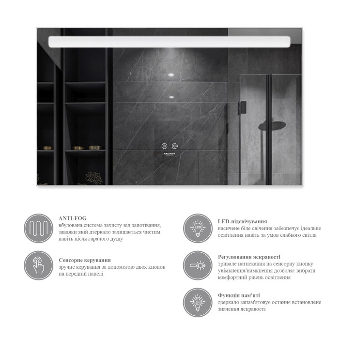 - ANTI-FOG – вбудована система захисту від запотівання, завдяки якій дзеркало залишається чистим навіть після гарячого душу.