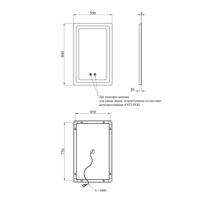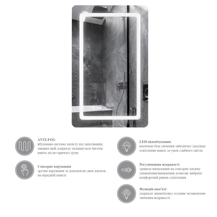 - ANTI-FOG – вбудована система захисту від запотівання, завдяки якій дзеркало залишається чистим навіть після гарячого душу.