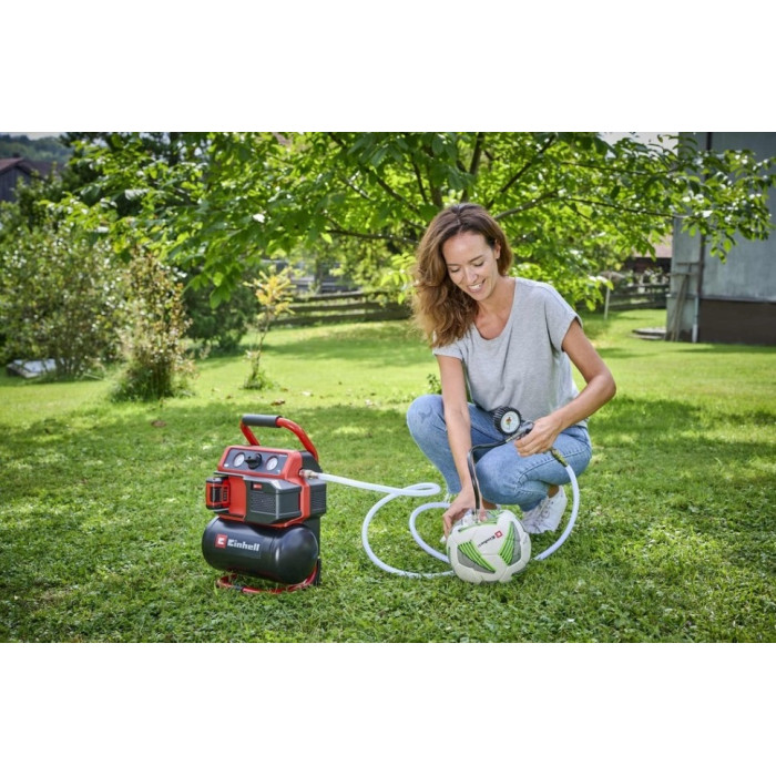 Компактний, переносний акумуляторний безмасляний компресор Einhell TE-AC 18/75 Li OF-Solo з прямим приводом у Вас не виникне проблем із повітрям, будь то в майстерні чи гаражі, підходить для робіт із застосуванням стисненого повітря, розпилення та накачування куль і коліс, для робіт з інструментом, працюючим від стисненого повітря.