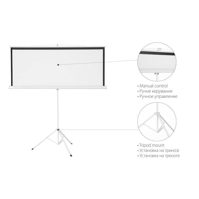 Екран на тринозі для презентацій, демонстрації фотографій та відео в офісах, навчальних закладах або домашніх умовах.