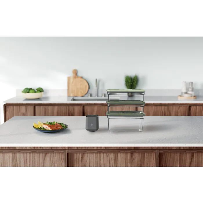 Вакуумний набір Electrolux Fresh Kit EVFK1+. Вакуумні пакувальні контейнери. Герметична кришка дає можливість довше зберігати продукти, зберігаючи корисні речовини. Виготовлений з нетоксичних матеріалів. Їх можна зберігати в морозилці і мити в посудомийній машині. У комплект входить вакуумний насос і 2 ємності об'ємом 1 л. Зберігайте продукти свіжими до 5 разів довше.