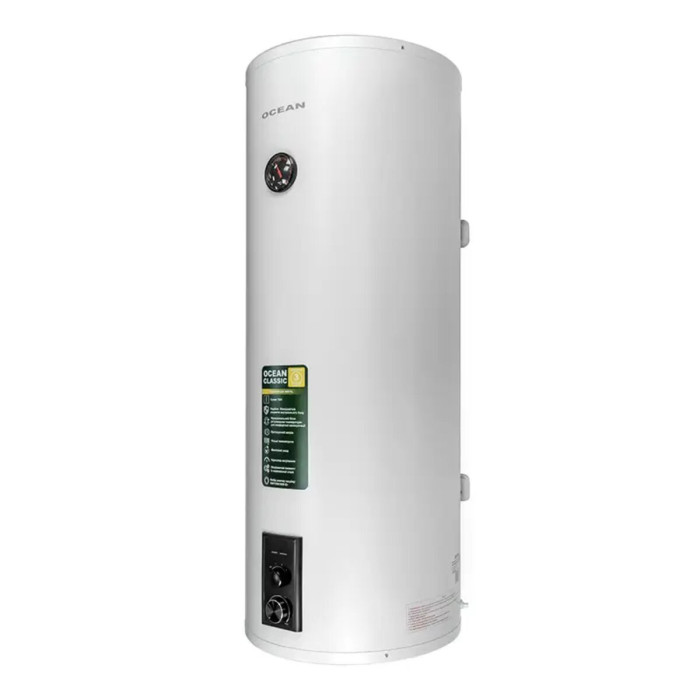Бойлер OCEAN Classic - цилиндрической формы, предназначен для установки только в вертикальном положении. Имеет 1 бак и 2 сухих тэна на 2 кВт (0.8 и 1.2 кВт). Регулировать включение тэнов можно на панели, расположенной на корпусе водонагревателя. Оба ТЭНа могут работать как поочередно, так и одновременно.