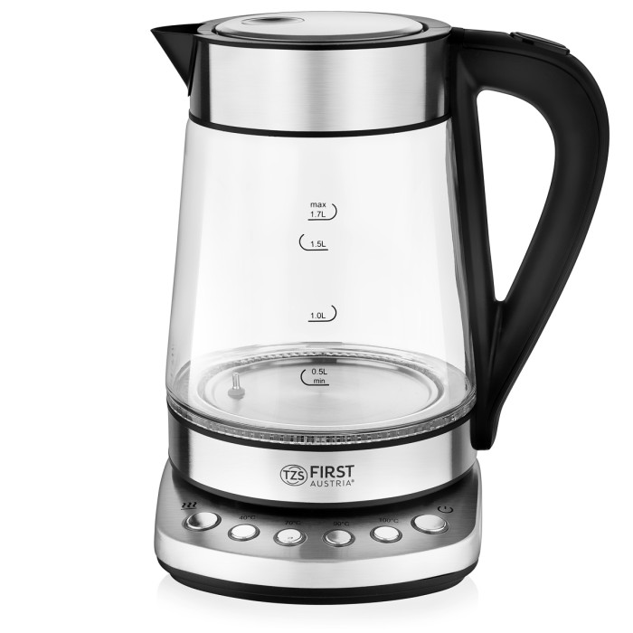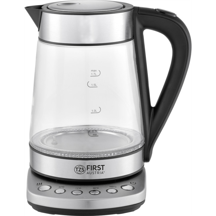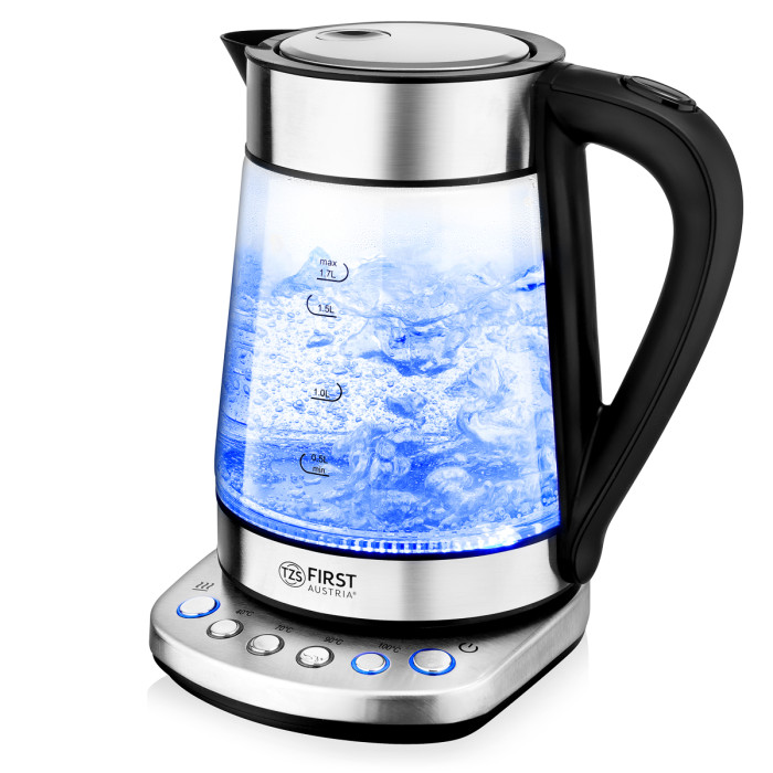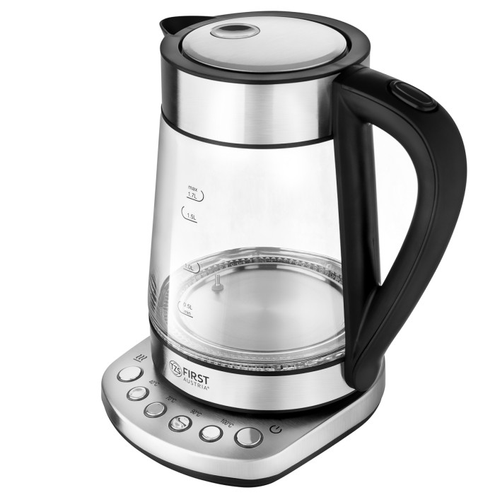 Нагрів відбувається дисковим елементом потужністю 2200 Вт до температур 40, 70, 90 і 100 градусів. На перших трьох рівнях чайник може підтримувати гарячу воду тривалий час. Під час роботи колбу електрочайника First FA-5405-9 увімкнені кнопки підсвічуються синіми світлодіодами.