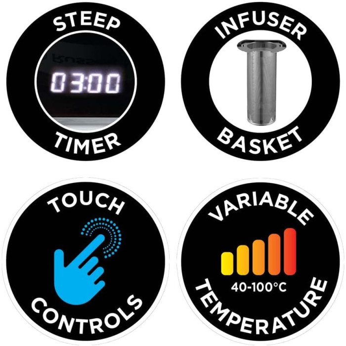 Підтримка заданої температури (термос), Поворот на підставці на 360°, Комплетується заварником із нержавіючої сталі для заварювання різних видів чаю, Знімний фільтр від накипу, Без світлового індикатора, З дисплеєм, З фільтром від накипу, З таймером увімк