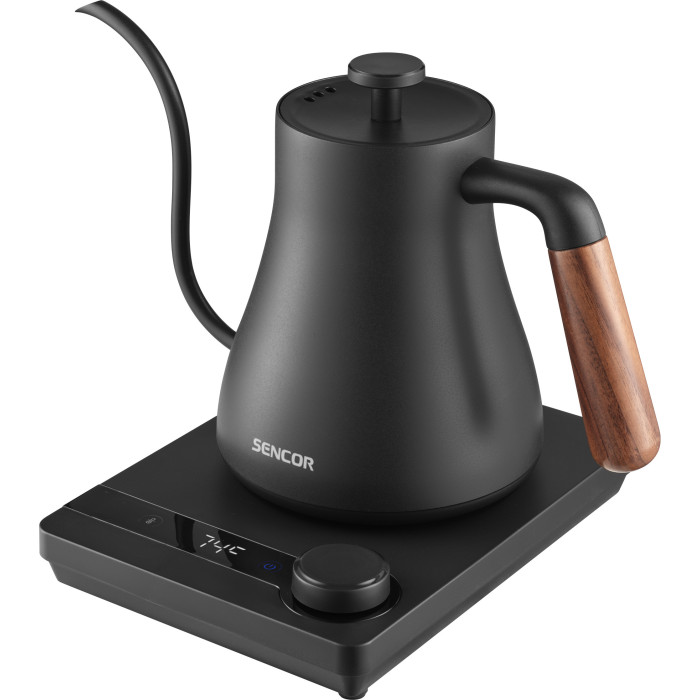 Sencor SWK2828BK — електрочайник об’ємом 0,6 л з потужністю 1000 Вт, 5 точними температурними режимами та функцією підтримки заданої температури протягом 2 годин. Має носик «гусяча шийка» для контрольованого наливання, ручку з натурального дерева та прихований нагрівальний елемент. Корпус із нержавіючої сталі SUS304, цифровий дисплей, захист від сухого кипіння та автоматичне вимкнення. Підходить для приготування кави V60, Chemex, фільтр-кави та чаю. Зручне зберігання шнура в підставці.