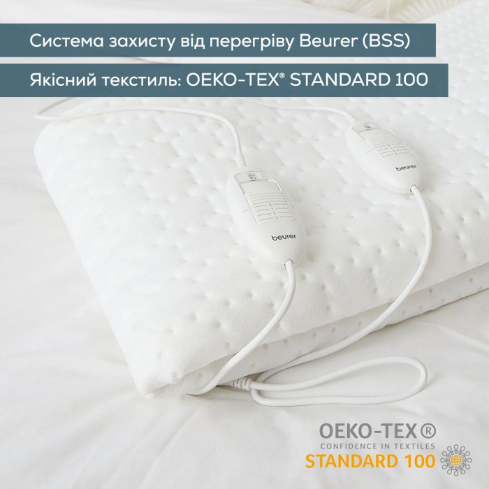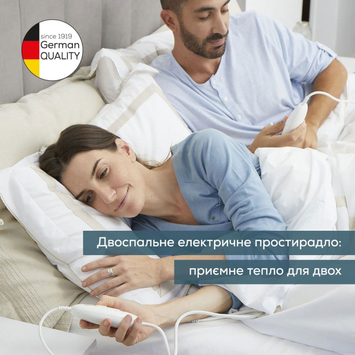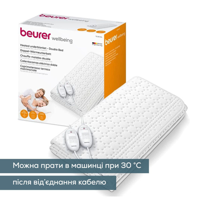 Електропростирадло Beurer, від мережі, 150х140см, 2х60Вт, 3 режими, для двох осіб, фліс, білий