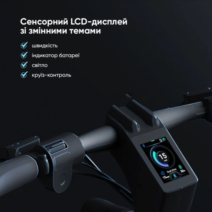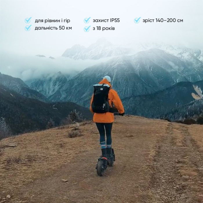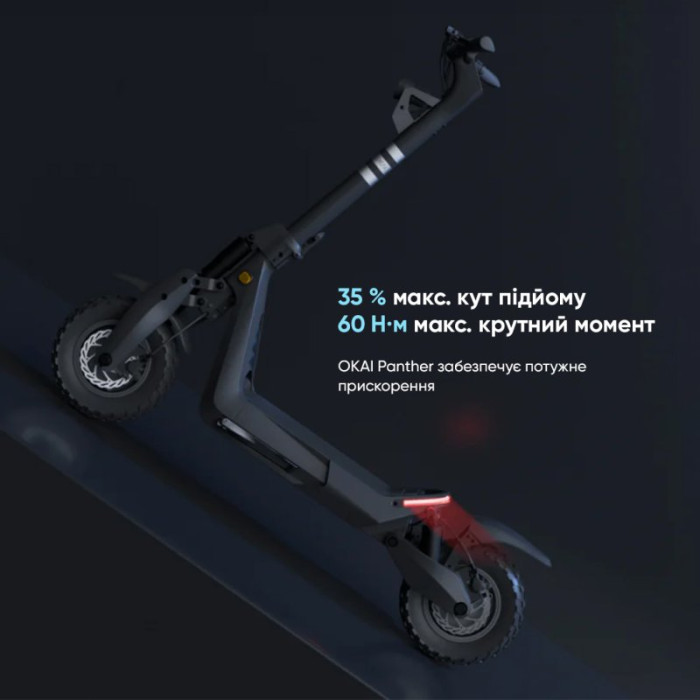 OKAI Panther ES800 — єдиний високопродуктивний позашляховий електросамокат, який виграв престижну нагороду IF Design Award у 2022 році та увійшов до списку 5 найкращих позашляхових електросамокатів 2023 року за версією Rider Guide. Він потужний, швидкий і зручний!НАЙВИЩА ПРОДУКТИВНІСТЬЕлектросамокат здатен розганятися до 60 км/год і підніматися на пагорби з кутом підйому до 35%. Здвоєні двигуни Panther — це сила, з якою слід рахуватися. Вони забезпечують пікову потужність до 3000 Вт з обертовим моментом 60 Н.м.СТВОРЕНИЙ ДЛЯ ДОРІГ І БЕЗДОРІЖЖЯ12-дюймові безкамерні шини в поєднанні із задніми амортизаторами автомобільного класу забезпечують комфортну їзду по бездоріжжю. А переднє електронне гальмо та заднє електронне та гідравлічне дискове гальмо забезпечують більш точний контроль керування та безпеку.ДОВГОВІЧНІСТЬ ТА БЕЗПЕКАЦілісна рама з алюмінієвого сплаву витримує максимальне навантаження 150 кг і містить портативний змінний літій-іонний акумулятор LG 52 В ємністю 19,2 Ач. Це дозволяє проїхати до 50 км на одному заряді. А технологія BMS від OKAI захищає від надмірного розряду, перезаряду, перевантаження по струму, короткого замикання та перегріву акумулятора.ЗРУЧНЕ КЕРУВАННЯІнтегрований сенсорний РК-дисплей додає Panther привабливості. Екран яскравий і легко читається як вдень, так і вночі. Він надає водієві основну інформацію про швидкість, заряд акумулятора, оцінку залишкового запасу ходу і режим руху. За допомогою додатку OKAI водій може вибрати, який дисплей підходить йому для зручного пересування містом.
