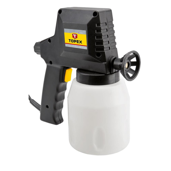 Пістолет-розпилювач електричний TOPEX може використовуватися для нанесення лакофарбових покриттів, а також розпилення інших речовин. Оснащений електричним двигуном потужністю 45 Вт, живлення від мережі 230 В. Обсяг ємності 900 мл. Бренд TOPEX призначений для домашніх майстрів.