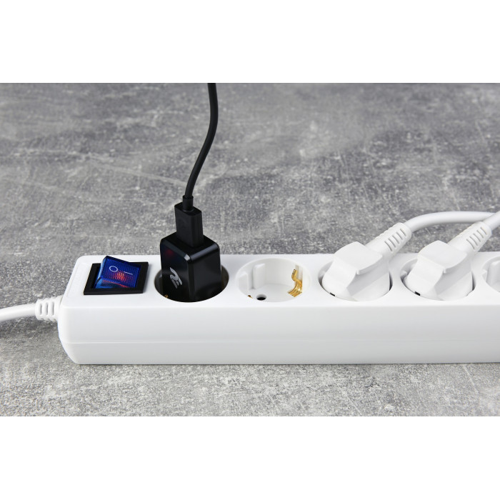Мережевий фільтр 2Е на 5хSchuko розетки Тип F (євророзетка) із заземленням, з вимикачем, зі шторками для захисту дітей, матеріал провідника: мідь, потужність вихідна макс.- 230В..