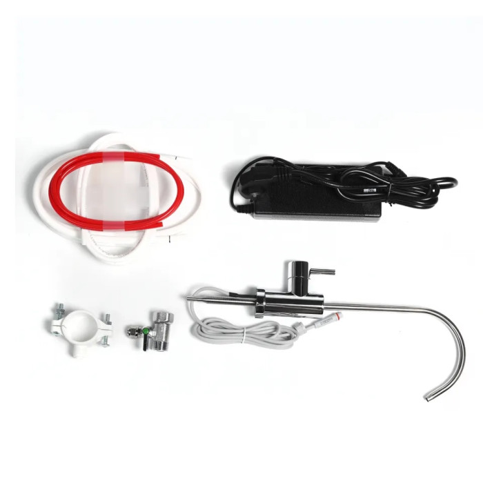 набір трубок, модуль фільтрації, комплект змінних картриджів, фасетка для очищеної води, вхідна муфта з краном подачі води, дренажний хомут, зовнішній блок живлення, посібник користувача
