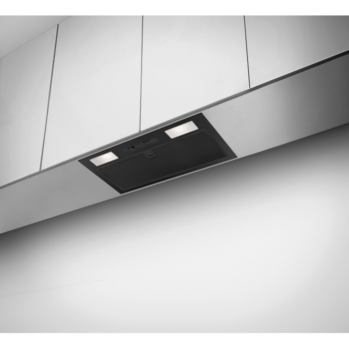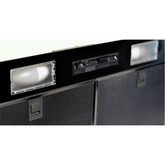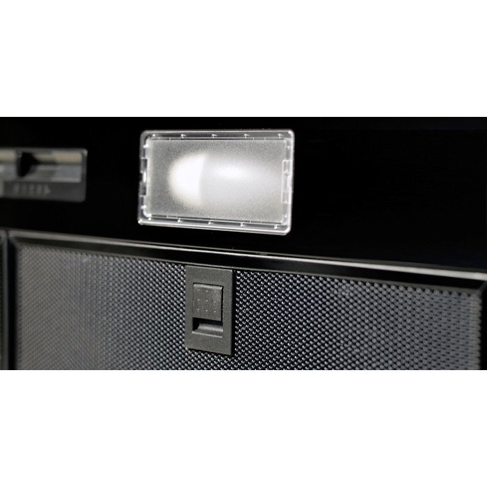 Витяжка, яка вбудовується в шафу FBI 525 BK, має 3 швидкості, можливість роботи в замкнутому контурі, енергозберігаюче LED підсвічування для комфортного освітлення та алюмінієвий фільтр чорного кольору, який можна мити в посудомийній машині. Рамка має товщину всього 7 мм і виконана у чорному матовому кольорі.