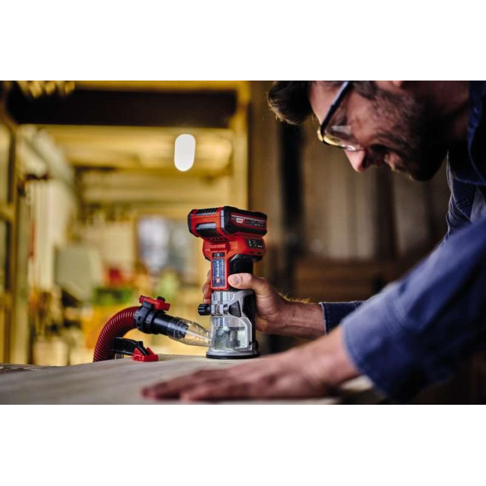 Акумуляторний безщітковий Фрезер окантувальний Einhell TP-ET 18 Li BL - Solo серії Professional є пристроєм сімейства Einhell Power X-Change і є високоякісним, потужним інструментом для фахівців для вирішення складних завдань формування бічної грані при обробці листового матеріалу, оформлення заокруглень та фасок, вирізання па для меблевої фурнітури, коригування шпону. Фрезер має безщітковий двигун для кращої продуктивності та продовження часу в порівнянні зі звичайними двигунами з вугільними щітками.