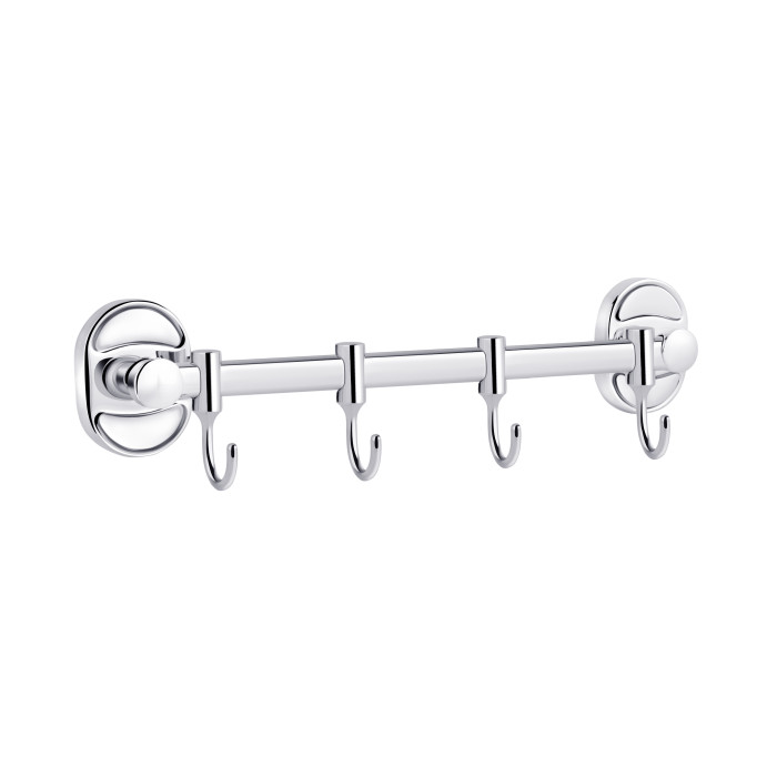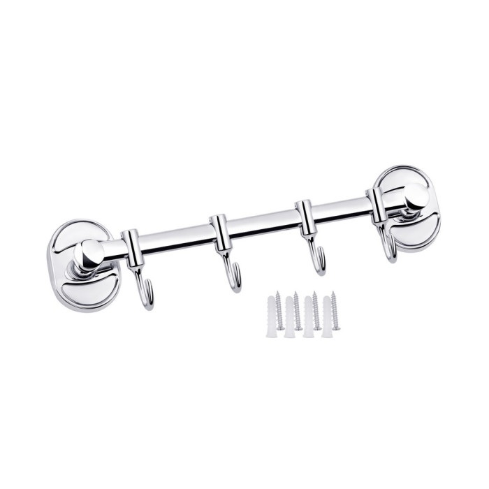 Тримач для рушників і халатів Kroner KRM Elbe - ACC2914-4 виготовлений у формі стрижня з чотирма пересувними гачками на ньому. Тримач для рушників виготовлений із міцного металу з хромованою поверхнею. Приховане кріплення дає змогу зберегти оздобу, а хромоване покриття запобіжить утворенню корозії та бруду. Тримач для рушників кріпиться на стіні на бажаній висоті.