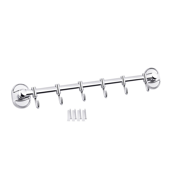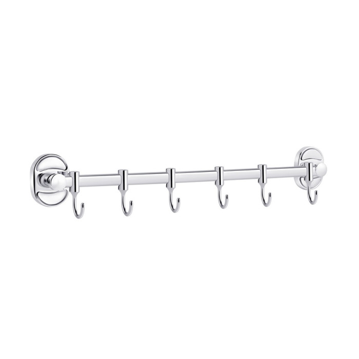 Тримач для рушників і халатів Kroner KRM Elbe - ACC2914-6 виготовлений у формі стрижня із шістьма пересувними гачками на ньому. Тримач для рушників виготовлений із міцного металу з хромованою поверхнею. Приховане кріплення дає змогу зберегти оздобу, а хромоване покриття запобіжить утворенню корозії та бруду. Тримач для рушників кріпиться на стіні на бажаній висоті.