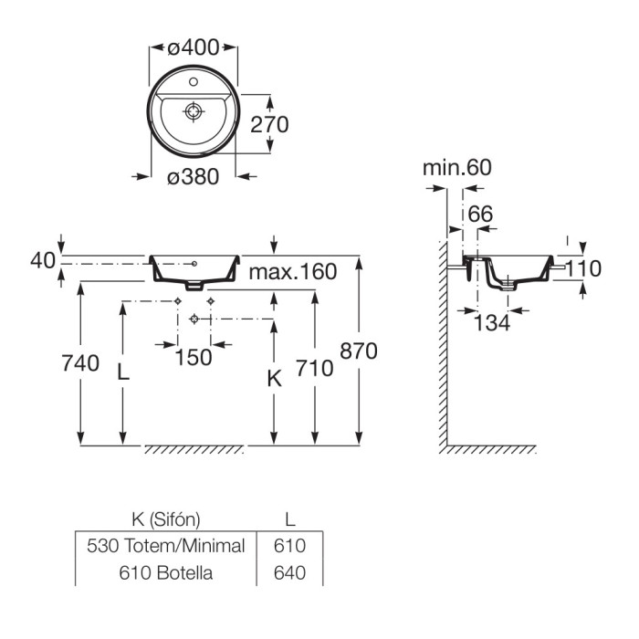 Умывальник ROCA GAP 40*40 см, встраиваемый, круглый, с отверстием под смеситель A3270Y4000