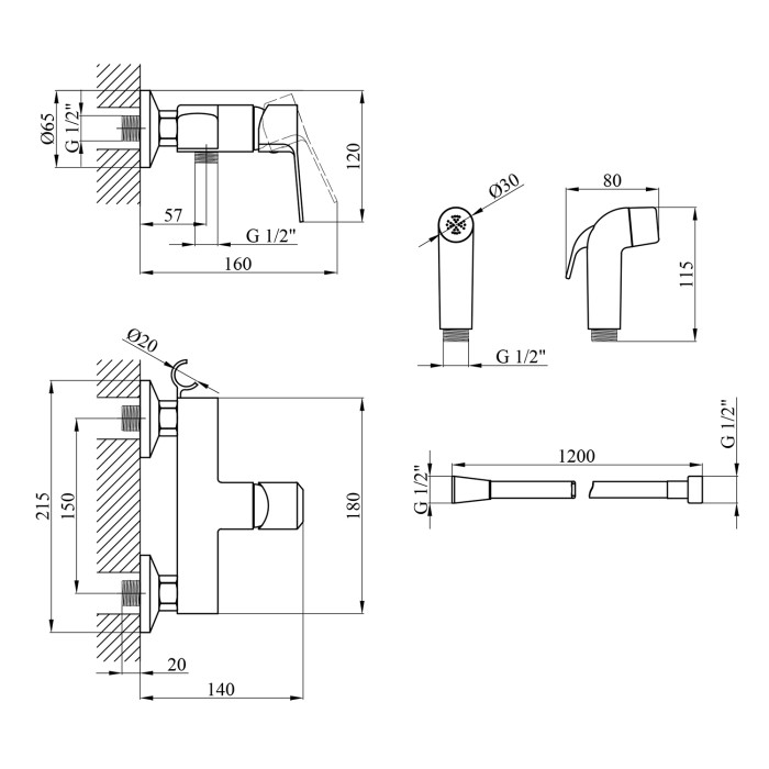 Змішувач, шланг для душу, лійка для гігієнічного душу, кріплення, інструкція.