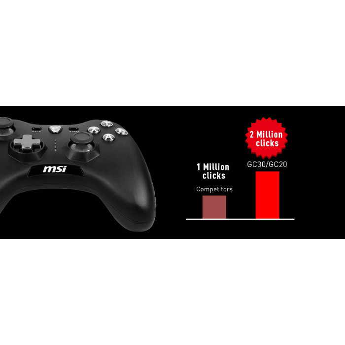 MSI Force GC20 V2 — дротовий геймпад для затятих гравців. Може використовуватися з різними платформами — ПК і Android-пристроями. У порівнянні зі звичайними контролерами, контролери серії Force GC використовують геймери, які по-справжньому насолоджуються своїми гоночними іграми за допомогою тригерів серії Force GC.
