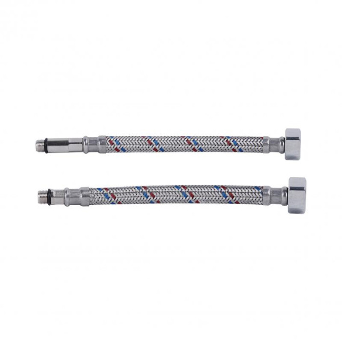 Такая гибкая подводка для воды SD Plus М10 60 см (пара) SD396W60 — все, что вам нужно, чтобы быстро и надежно подсоединить сантехнический смеситель к системе подачи горячей и холодной хозяйственно-питьевой воды. С одной стороны изделия — штуцер М10, с другой — гайка с внутренней резьбой 1/2". Сам шланг выполнен из резины, спрятан внутри оплетки из нержавеющей стали.